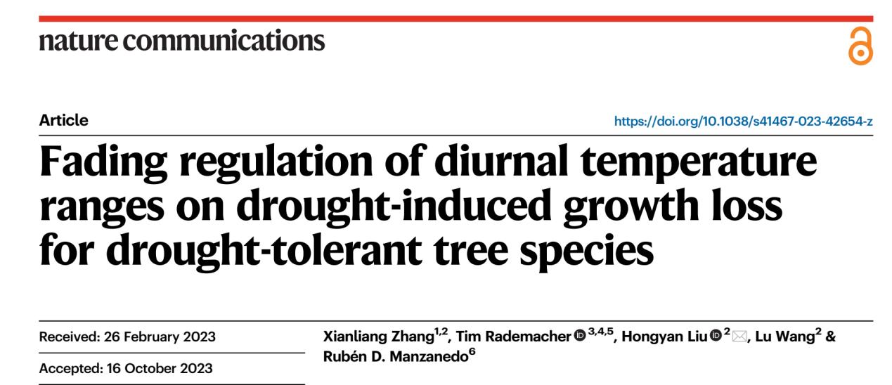 近日,我校bat365官网登录入口张先亮教授与北京大学城市与环境学院刘鸿雁教授研究组合作在Nature子刊《Nature Communications》发表研究论文“Fading regulation of diurnal temperature ranges on drought-induced growth loss for drought-tolerant tree species”,量化了不同时间段内昼夜温差与干旱的交互作用对树木生长的影响与树种水力指数之间的关系。