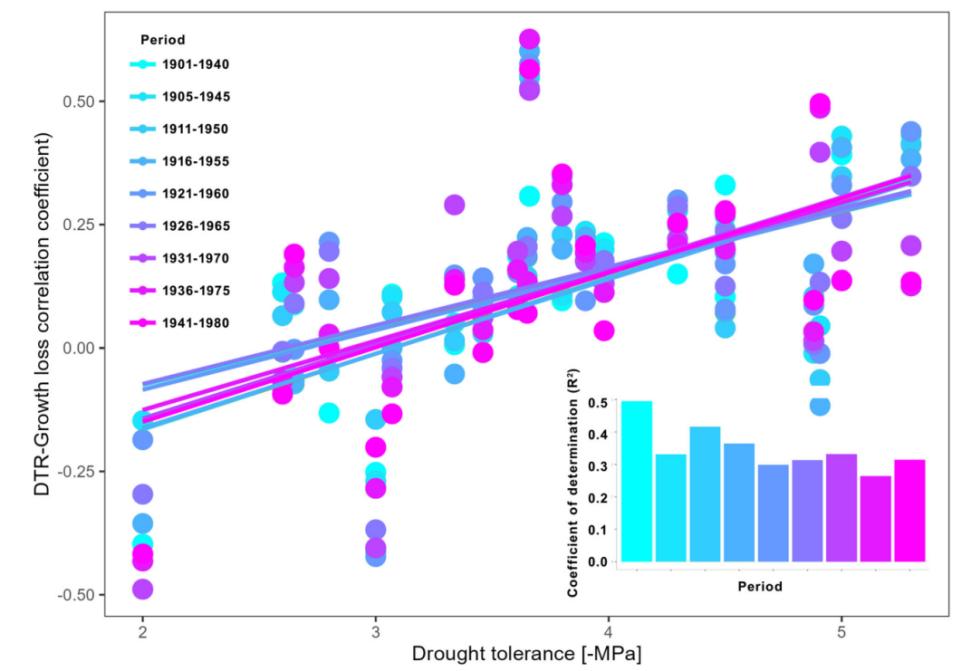 图1.昼夜温差与干旱导致的生长损失之间的相关系数与树种的抗旱性之间的关系随时间的变化