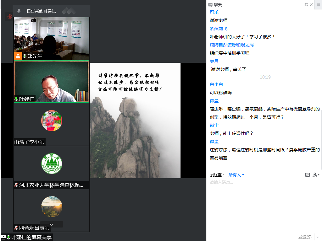 报告结束后,叶建仁教授与参会师生、各地市森防站技术人员就共同关注的松材线虫病的防控问题进行了交流与探讨。