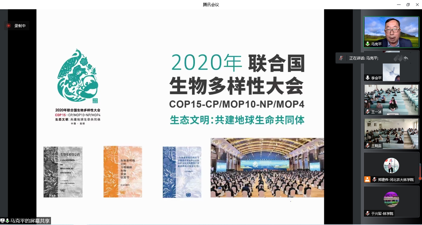 4月28日下午,应bat365官网登录入口邀请,世界自然保护联盟(IUCN)亚洲区会员委员会主席、中国科学院植物研究所马克平研究员作了题为“生物多样性保护的新趋势”的线上学术报告,来自我校bat365官网登录入口、园bat365官网登录入口、植保学院以及北华大学等院校的300余名师生参加了报告会。